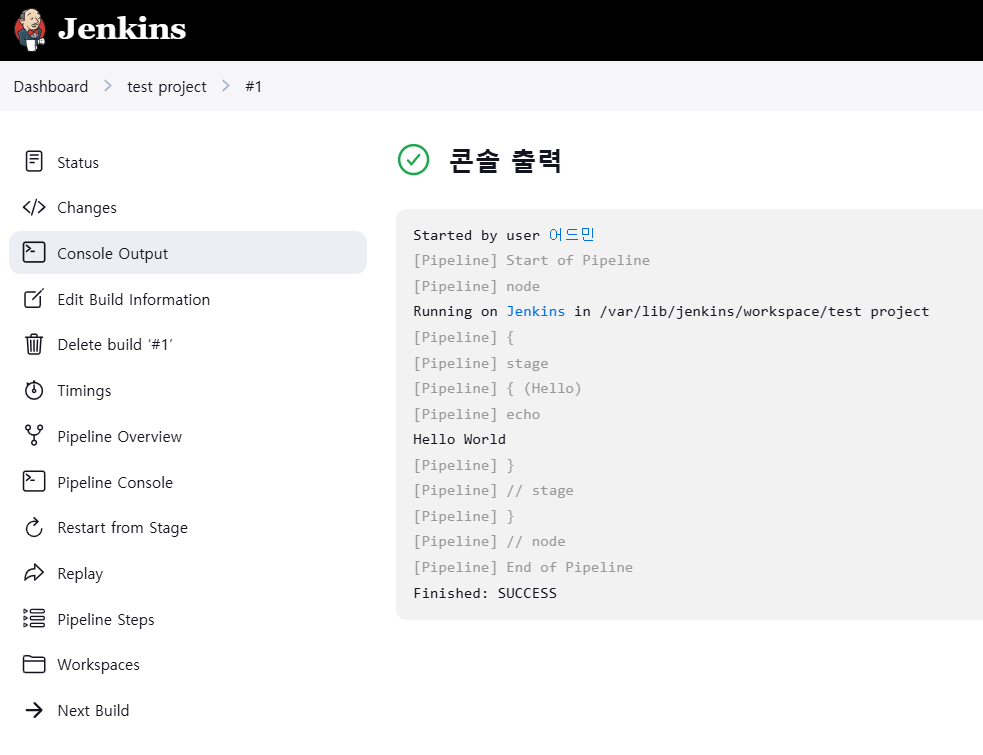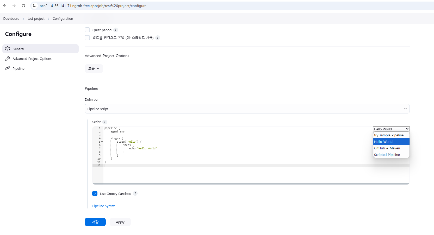 - 젠킨스가 동작을 하면 이 파이프라인에 따라서 에코 헬로월드 찍고 끝나는 간단한 샘플 코드다. 이러고 저장한다.