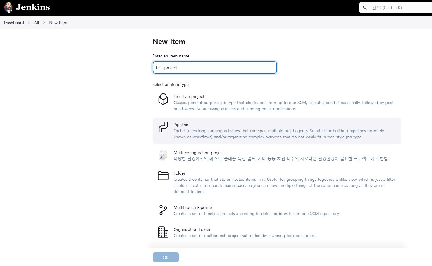 - pipeline을 쓴다. 클릭하고 ok.