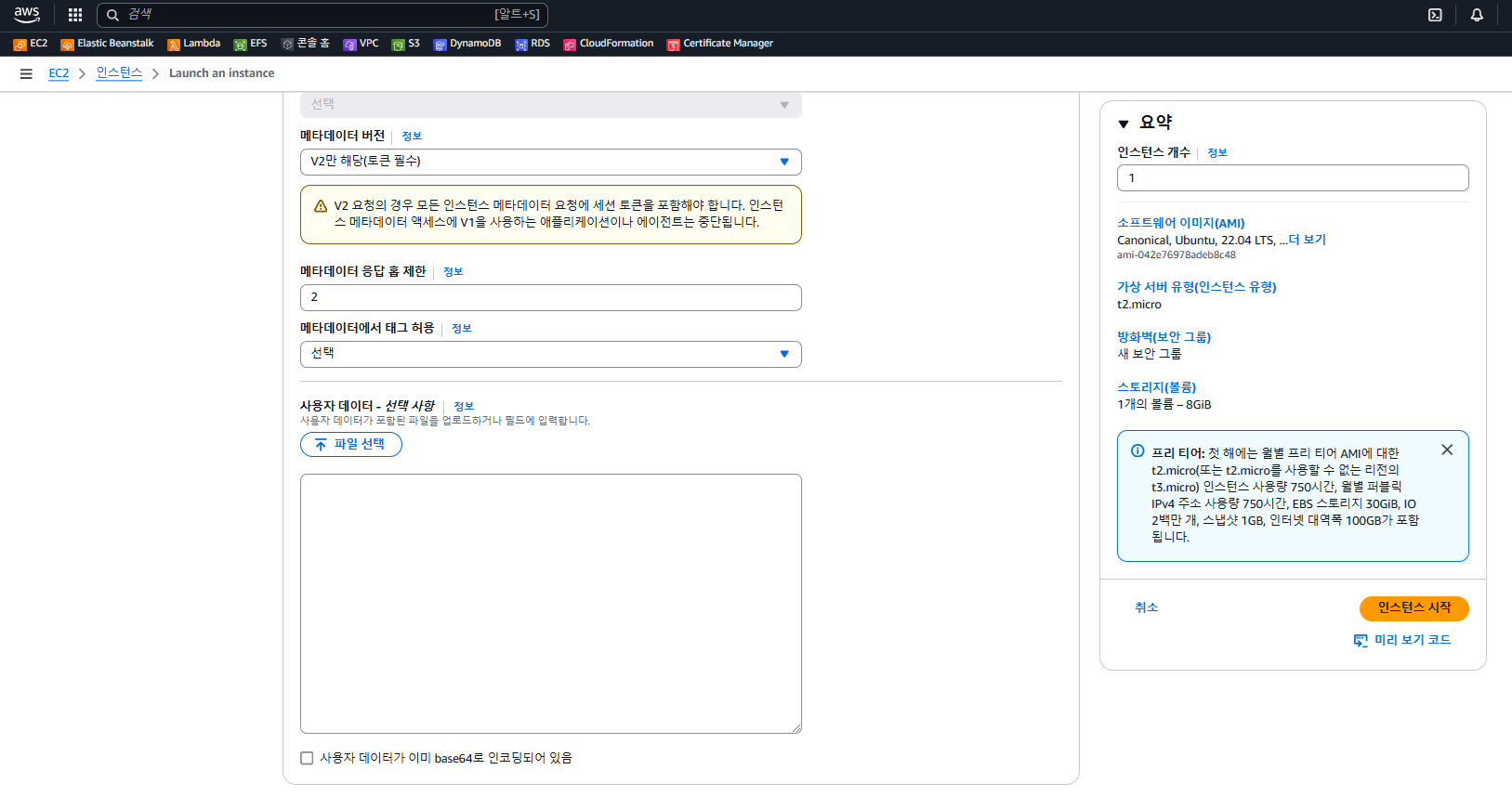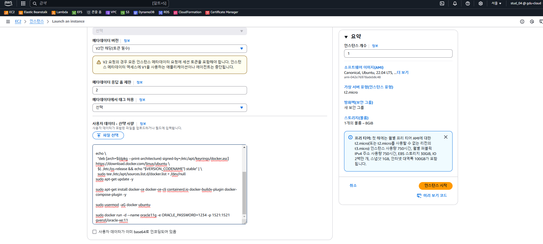 - 맨 밑의 사용자 데이터 - 선택사항에 수업때 했던 대로 쉘 스크립트를 복사해 넣는다.