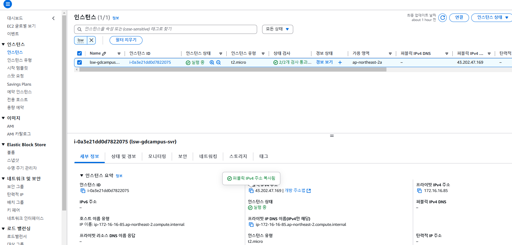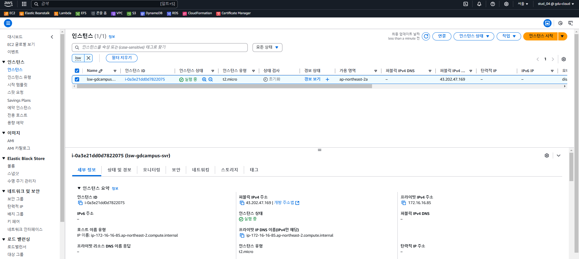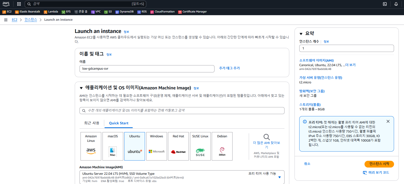- 인스턴스 이름에 lsw-gdcampus-svr을 줬다.
