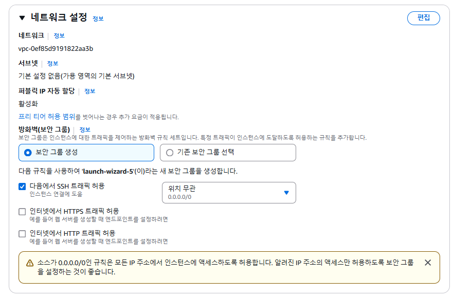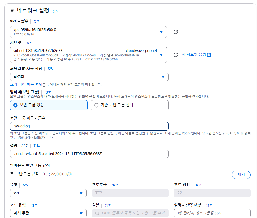 - 방화벽(보안 그룹)은 생성한다. 보안그룹 생성을 선택하고 보안 그룹 이름으로 lsw-gd-sg를 줬다.