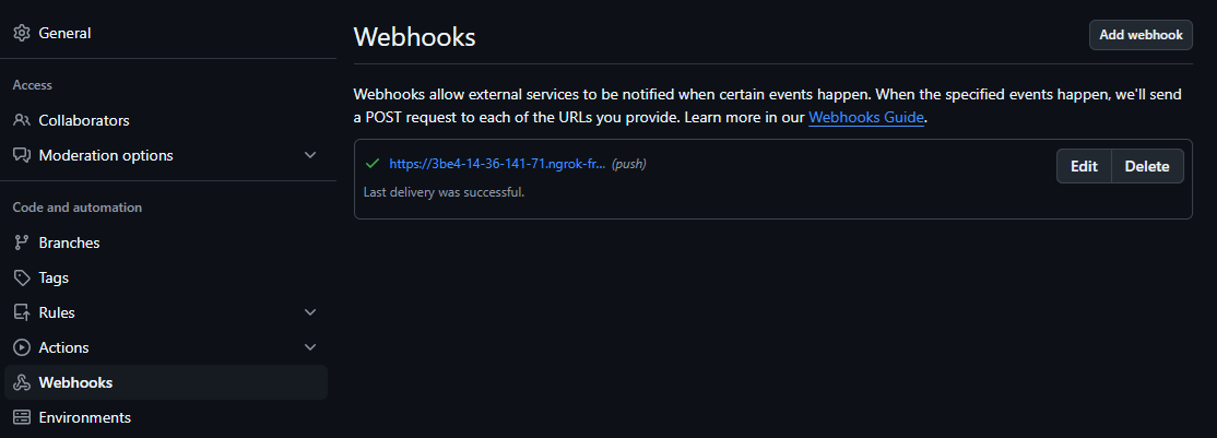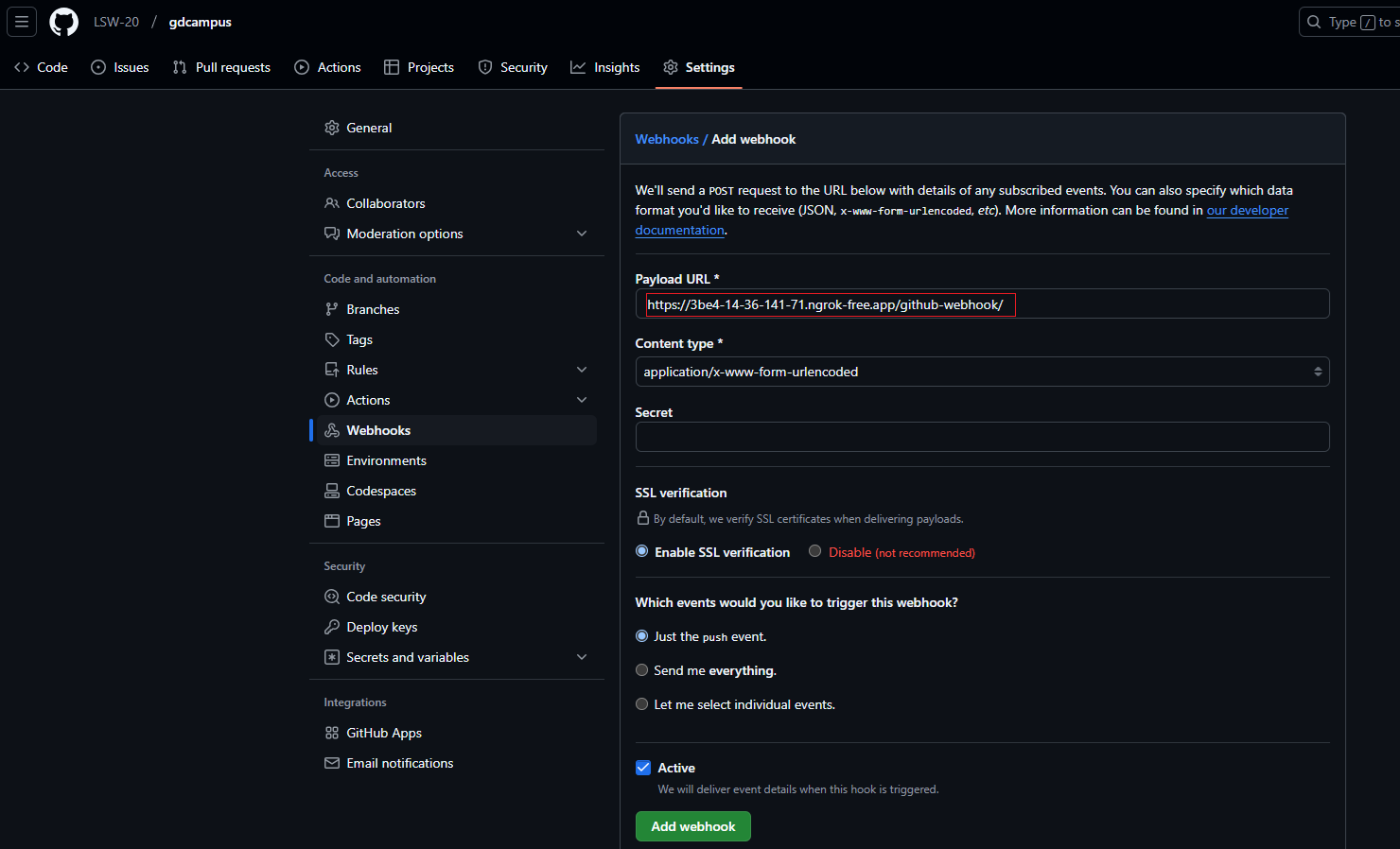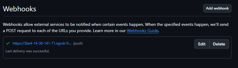 - 페이로드url을 작성하고 add webhook을 누른다.
