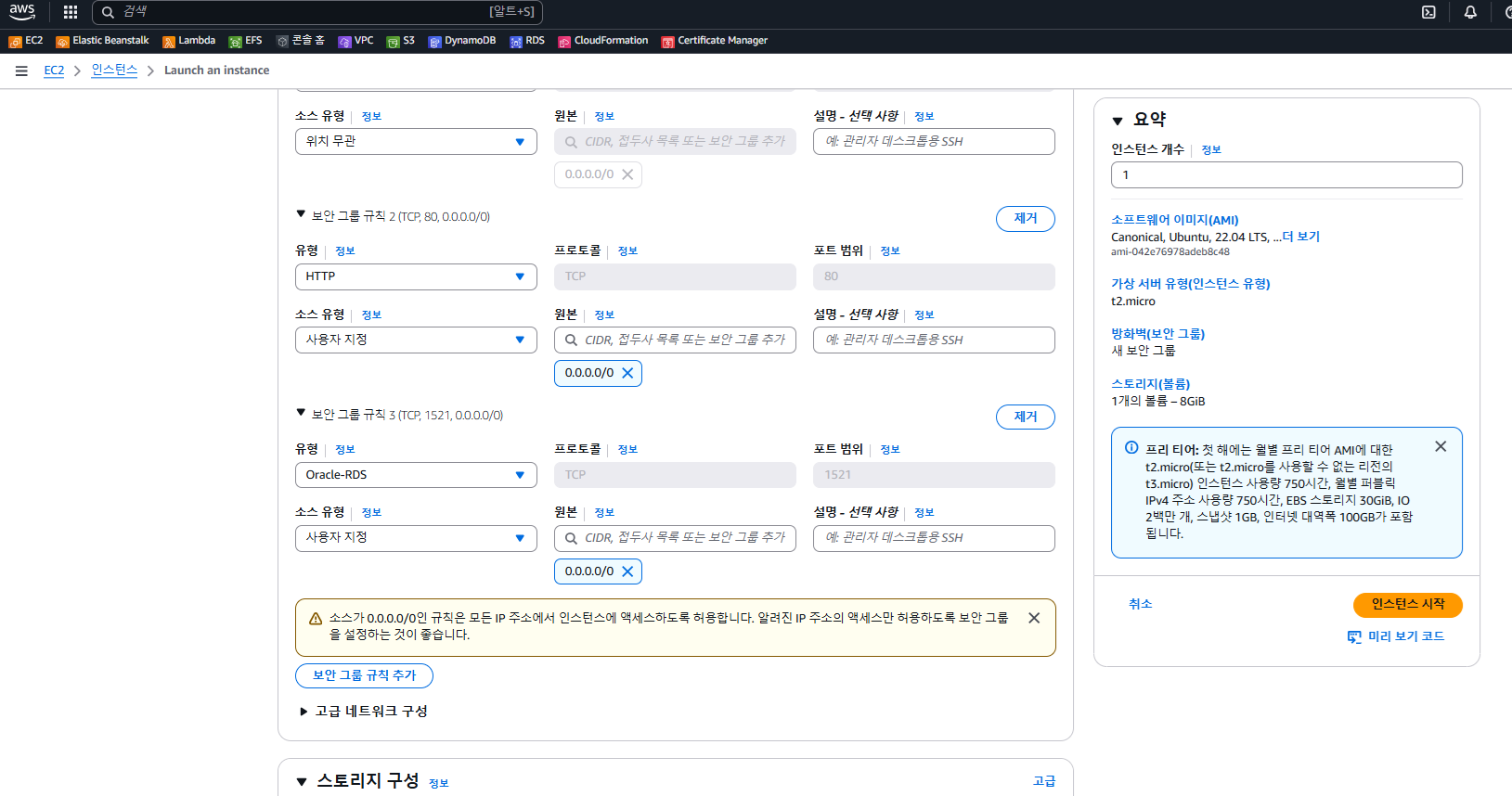 - 위처럼 2개를 추가했다. HTTP, Oracle-RDS를 하고 둘다 0.0.0.0/0을 줬다.