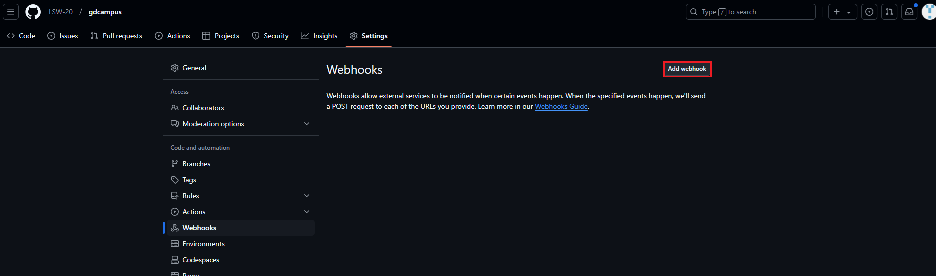- 깃허브 저장소에서 애드웹훅 누른다.
