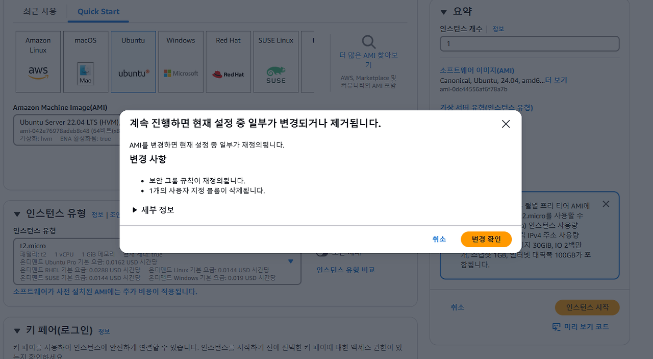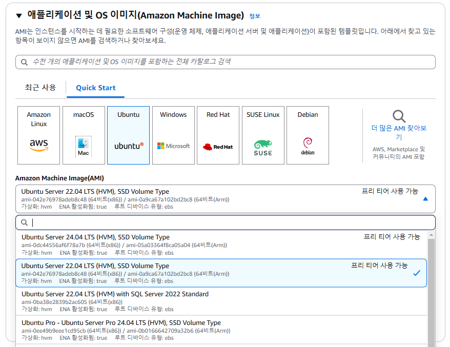 - os는 우분투, ami는 2번째꺼 22.04를 선택했다.
