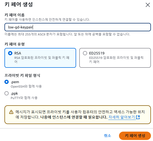 - 키 페어 유형은 RSA, 프라이빗 키 파일 형식은 .pem으로 했다.