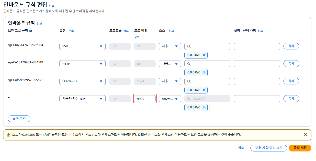 - 인바운드 규칙 편집에서 현재 우리 애플리케이션 포트번호가 9999라서 저걸 했다.