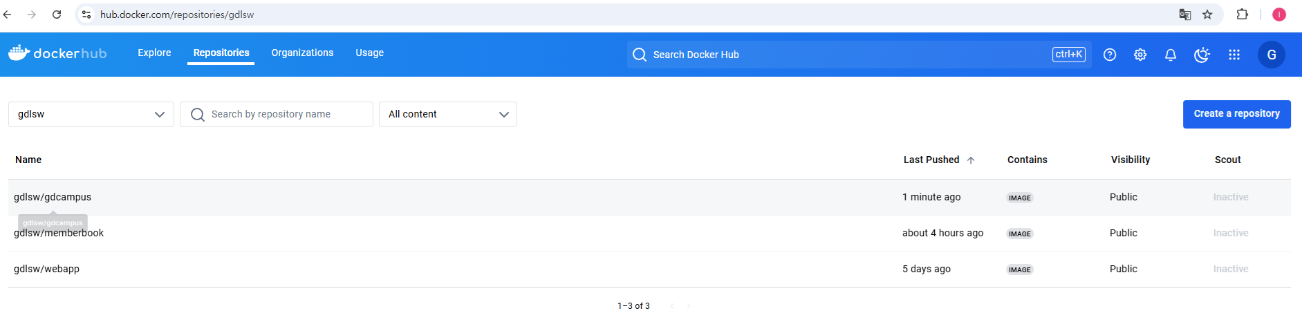 - 도커허브에서도 확인해본다.