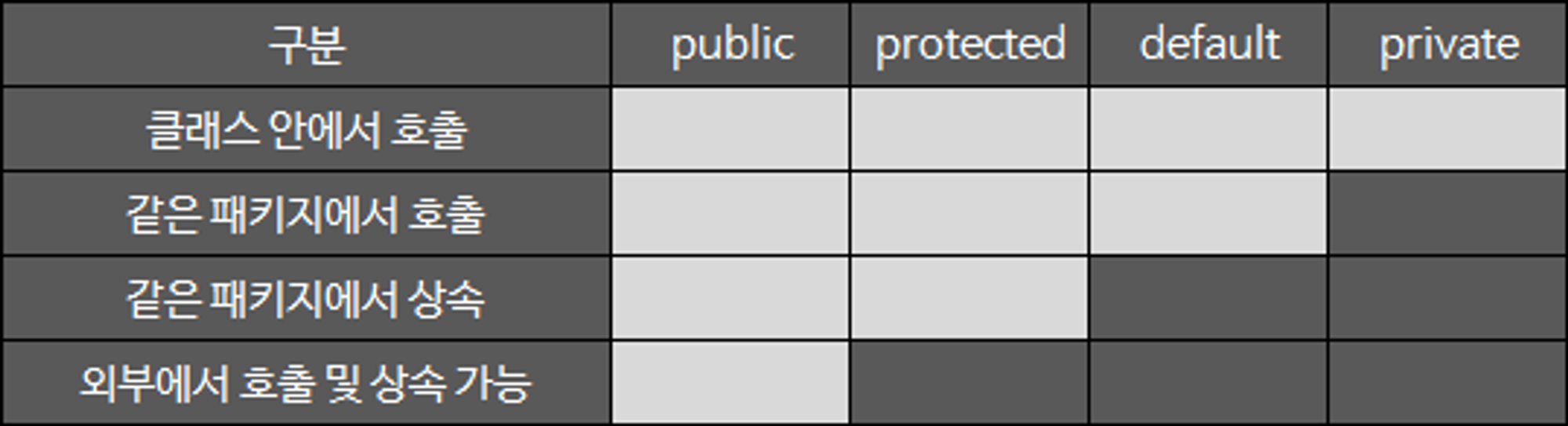 - default: 같은 패키지에 소속된 클래스에서만 사용 가능