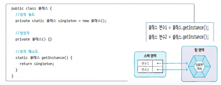 - 이러면 외부에서는 클래스 변수 = 클래스.getInstance(); 이런 식으로 객체를 얻음.