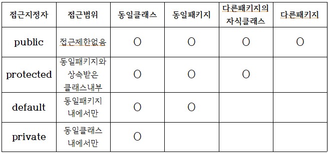 ㅁ default로 선언된 생성자, 필드, 메서드는 다른 패키지의 클래스에서 import해도 쓸 수 없다.